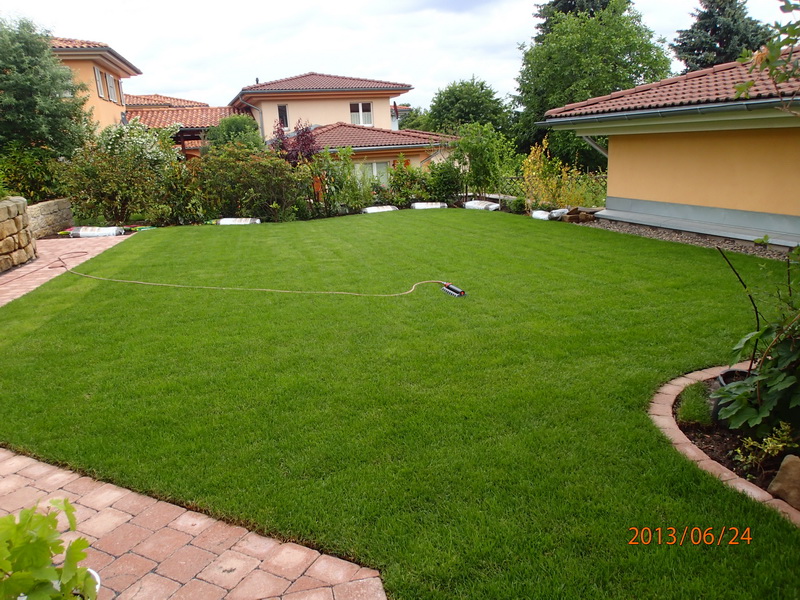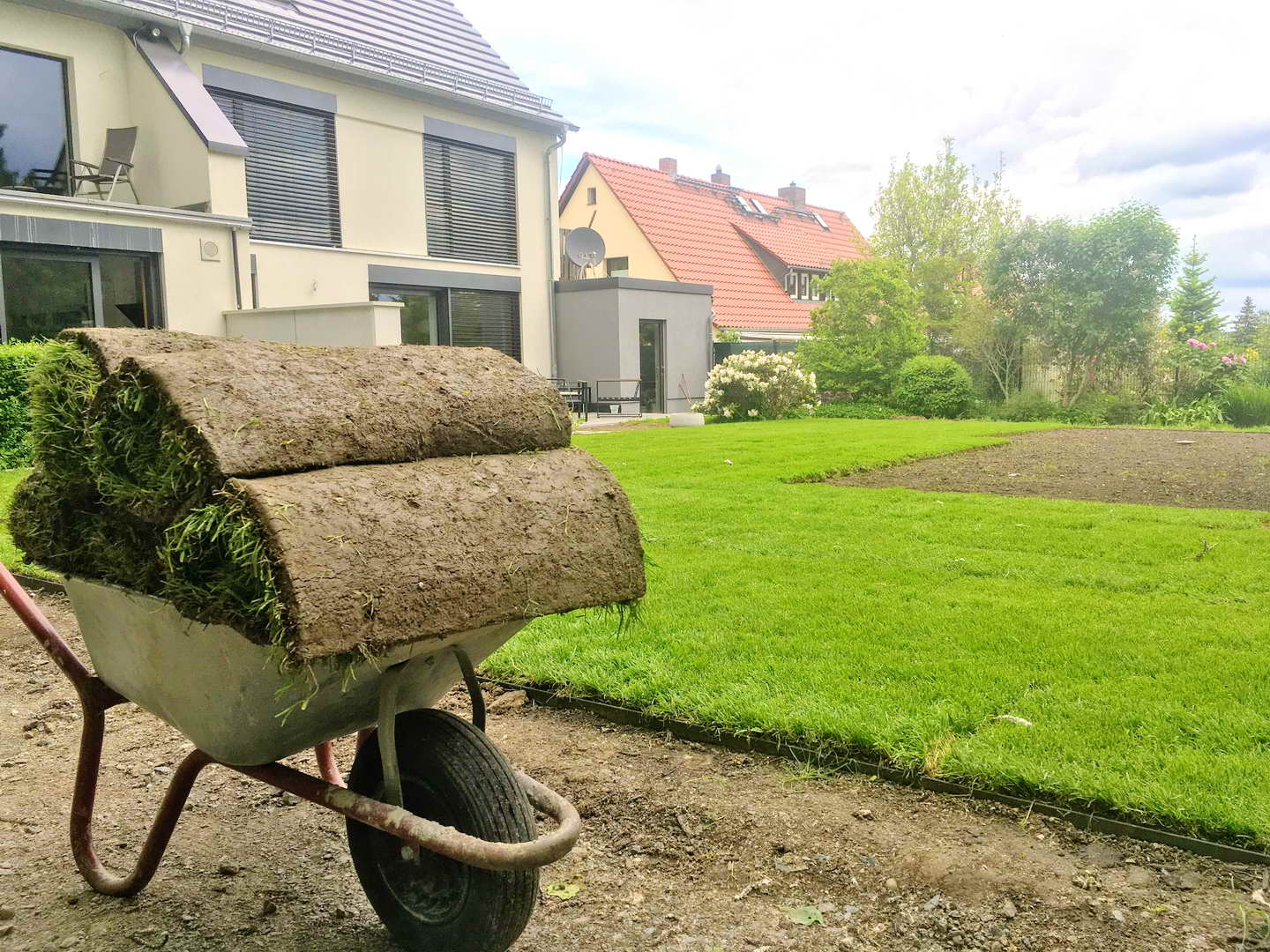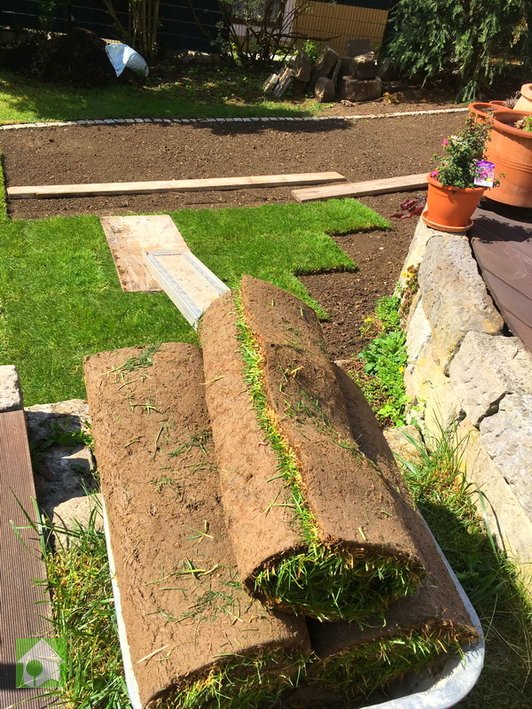 - Sobald der Rasen mit dem Untergrund verwachsen ist, kann „normal“ bewässert werden.